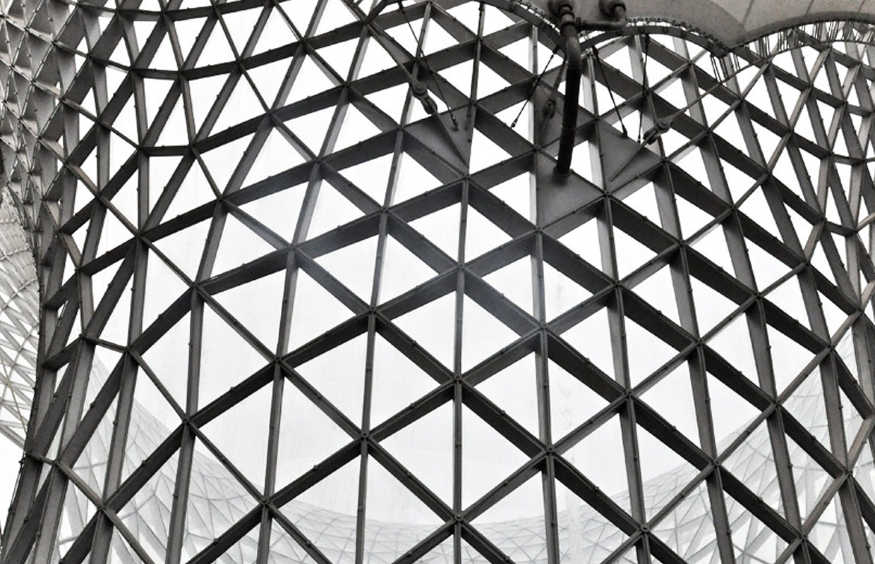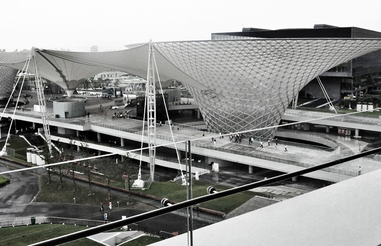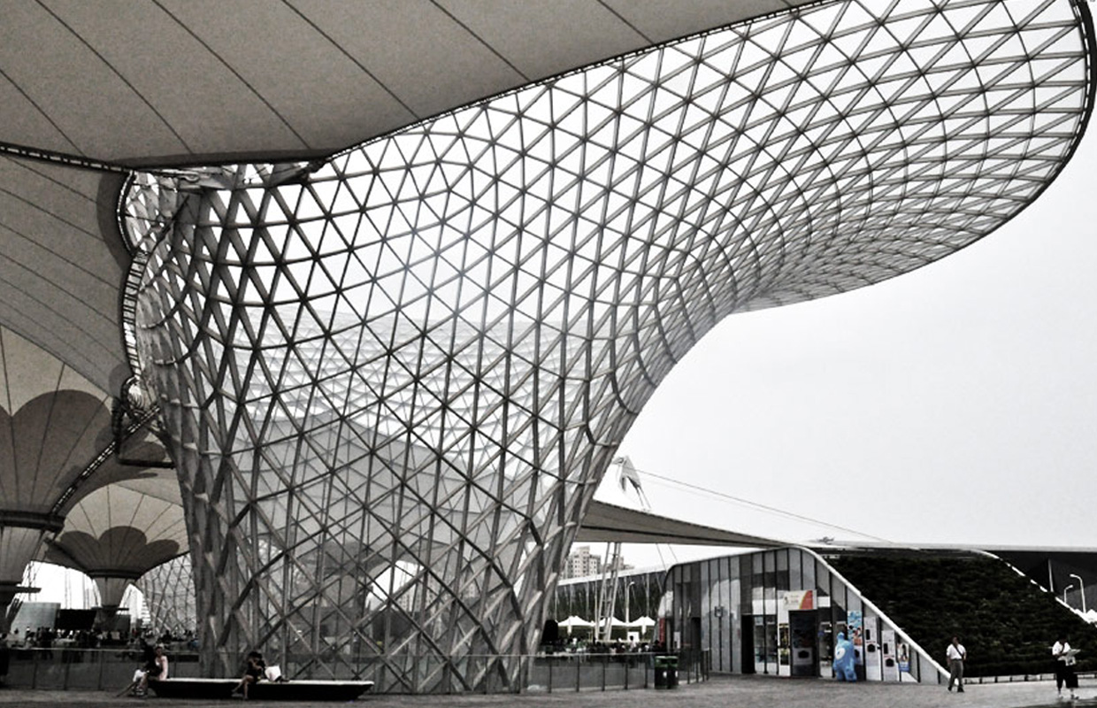 The EXPO Axis in Shanghai is one of the world's largest membrane roofs. As an employee at the Knippers Helbig office (before Programming Architecture was founded), Dr. Milos Dimcic had a task to generate an acceptable grid for the 6 funnel-like structures called Sun Valleys. Using structural relaxation techniques, a smooth and statically efficient triangular grid was generated over 6 free form surfaces, resulting in ~30.000 (5.000 x 6) unique structural members and 10.500 (1740 x 6) different structural joints.